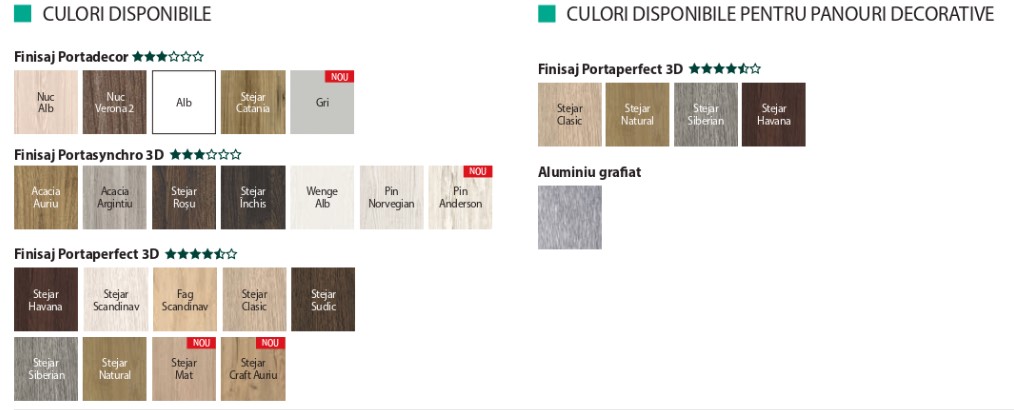 Pentru modelele pe culoarea Alb se pot alege panourile decorative pe următoarele finisaje: Portaperfect și Aluminiu grafiat ( cost suplimentar).