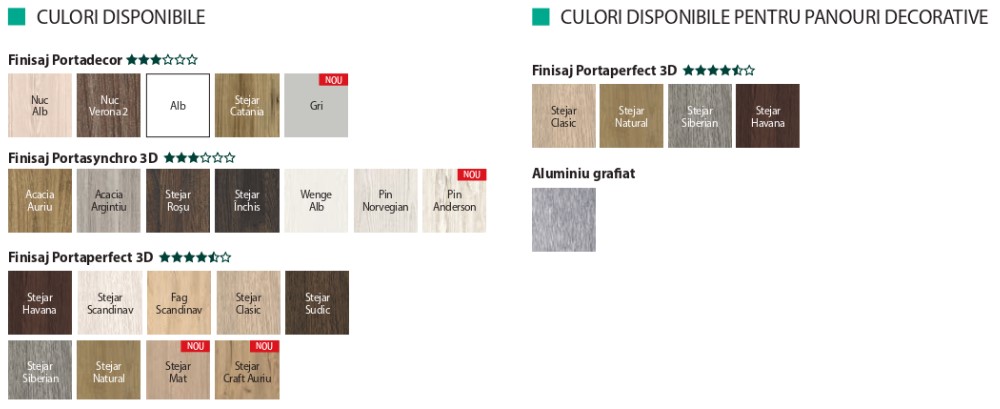 Pentru modelele pe culoarea Alb se pot alege panourile decorative pe următoarele finisaje: Portaperfect și Aluminiu grafiat ( cost suplimentar).